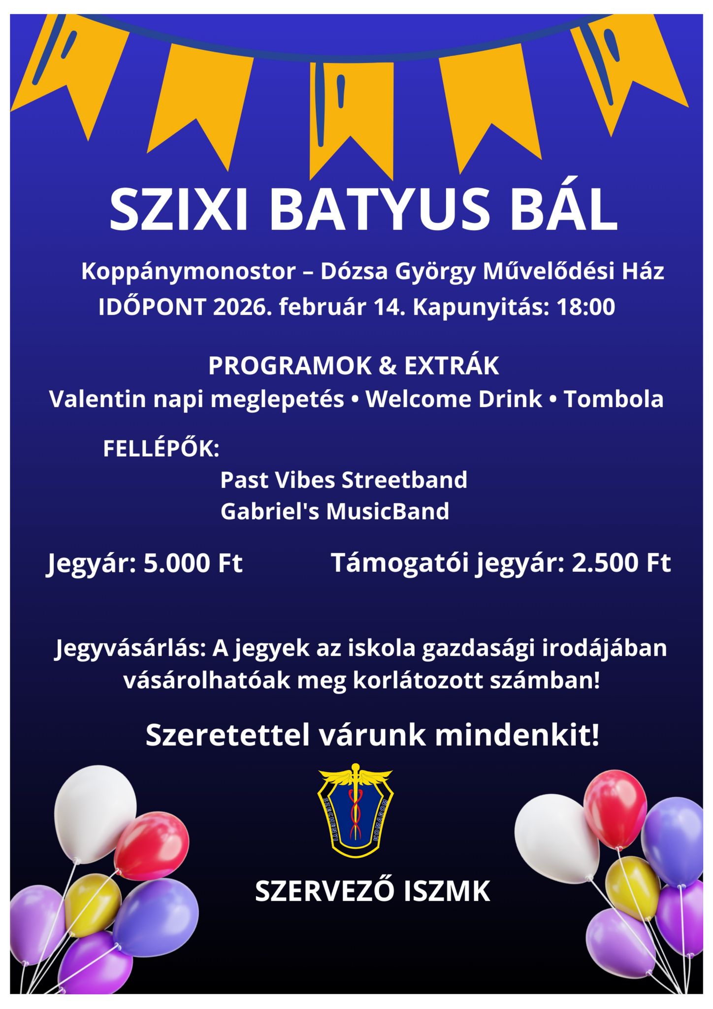 Örömmel hirdetjük, hogy 2026. február 14-én ismét megrendezésre kerül a SZIXI Batyus Bál, az iskola egyik legnépszerűbb közösségi eseménye. Várunk mindenkit egy vidám, zenés, táncos estére, ahol a jó hangulat és a közös élmények garantáltak!